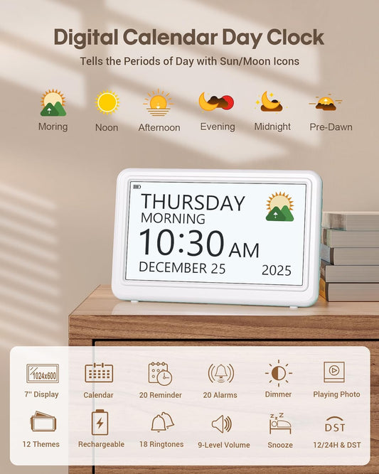 Digital Clock with Date and Day of Week, Dementia Clocks Battery Operated Alarm Clock with 20 Alarms and Medicine Reminders, 7" Large Display Rechargeable Desk Clock for Elderly Seniors Alzheimers