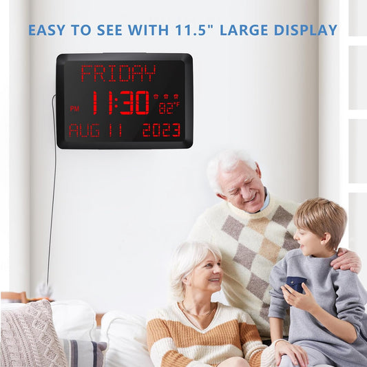 Raynic Digital Clock, 11.5" Large Display Calendar Clock with Day and Date, Indoor Temperature, Adjustable Brightness, Snooze,12/24H, DST for Home, Office, Elderly