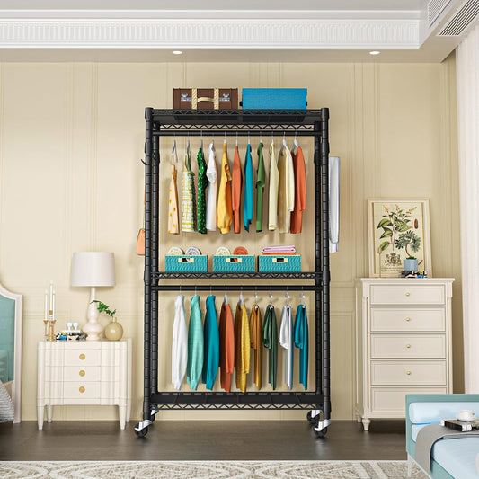 Heavy Duty Clothes Rack for Hanging Clothes, Double Rods Clothing Rack with Lockable Wheels, Rolling Garment Racks with Shelf, Easy to Assemble, Black