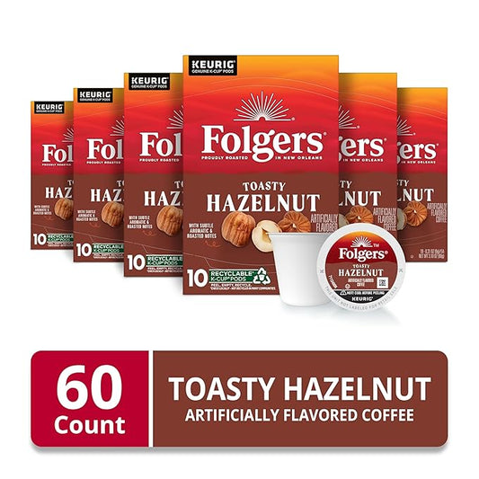 Folgers Toasty Hazelnut Artificially Flavored Coffee, Keurig K-Cup pods, 10 Count Box (Pack of 6)
