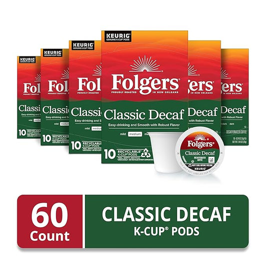Folgers Classic Decaf Coffee, Keurig K-Cup Pods, 10 Count Box (Pack of 6)