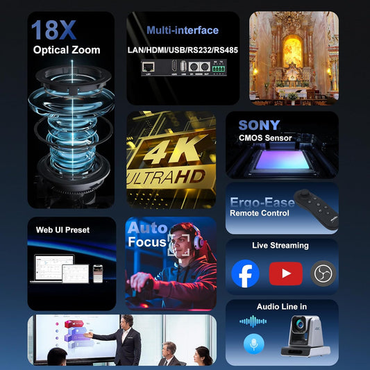 4K USB/HDMI/LAN PTZ Camera, Ergo-Ease Remote Control, Auto Focus, 18X Optical Zoom, Live Streaming for Video Conference, Meeting, Church, Event, Teaching