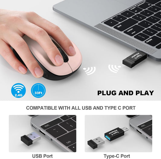 WisFox 2.4G Wireless Mouse for Laptop, Ergonomic Computer Mouse with USB Receiver and Type-C Adapter, 3 Adjustable Levels DPI, 6 Button Cordless Wireless Mice (Pink)