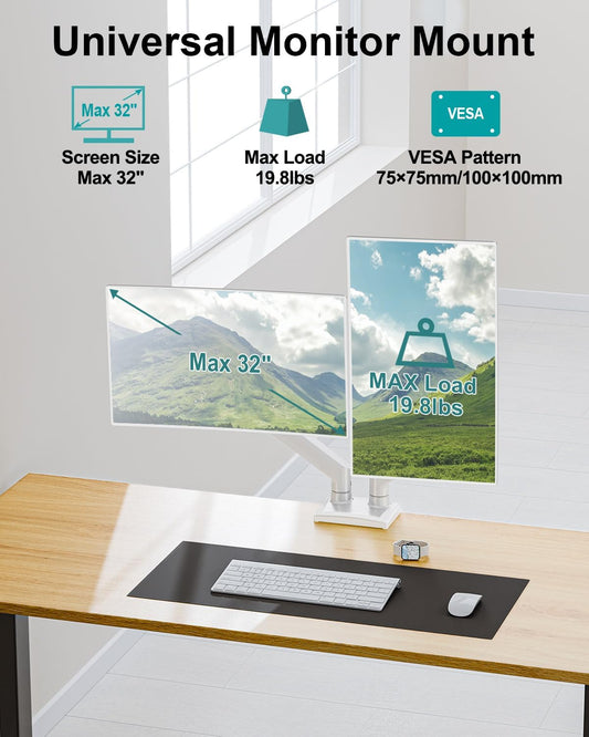 Dual Monitor Desk Mount - Adjustable Monitor Arm for 2 Monitors up to 32 inches/19.8 lbs, Double Monitor Stand VESA Bracket with C-Clamp & Grommet Mounting, Computer Screen Mount, White, Freelift