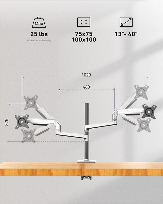 Triple Monitor Mount, Holds Screens up to 40 Inches and 25 lbs, Fully Adjustable 3 Monitor Desk Mount with C-Clamp and Grommet Base, Aluminum, Silver