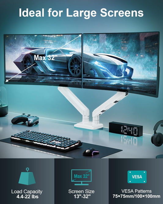 Dual Monitor Desk Mount, 13-32 inch Adjustable Gas Spring Monitor Arm, Computer Display Stand Holder with Clamp and Grommet Base, Fits 4.4 to 22lbs Screens, VESA Mount Bracket, White, Freelift Pro