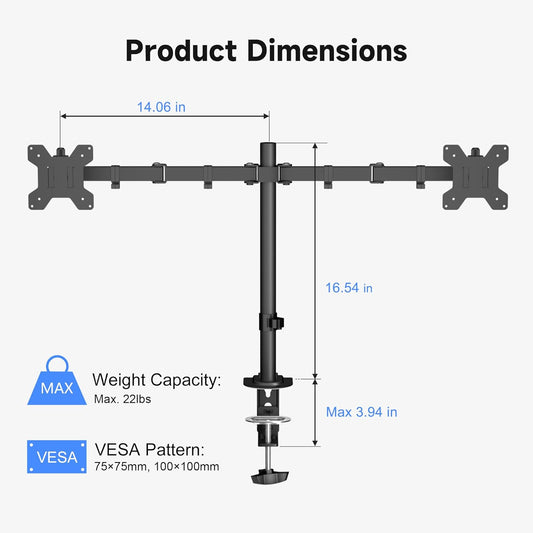 Pholiten Dual Monitor Stand, Heavy Duty Adjustable Monitor Arm Desk Mount for 2 Screens up to 32 Inches, Tilt, Swivel, Rotate, Supports Tilt, Swivel, Rotate, Supports 22 lbs per Monitor Arm