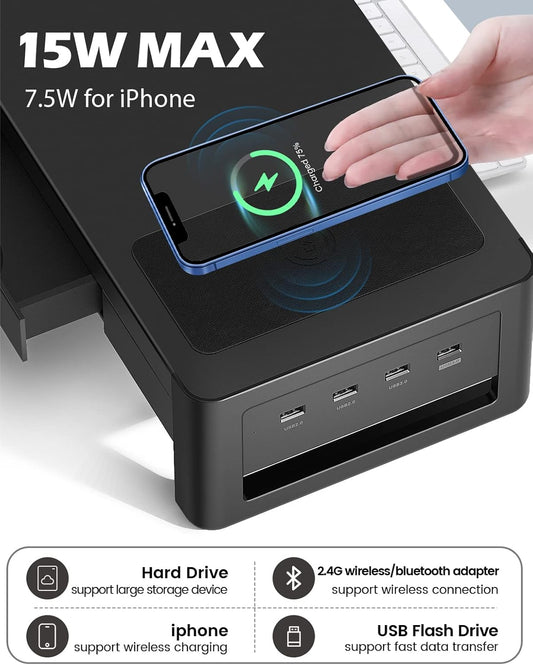 meatanty Dual Monitor Stand Riser with 2 Drawers,4 USB Ports and Charging Pad,Metal Monitor Stand for 2 Monitors Supports Transfer Data and Charging,Desk Organizer for PC,iMac(38.7 inches)