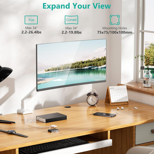 Single Monitor Arm Holds 4.4-22lbs, Monitor Stand for Desk, Height Adjustable Monitors Mount for 32 27 24 22inch, Full-Motion Monitors Desk Mount with C-Clamp&Grommet Base, Freelift White