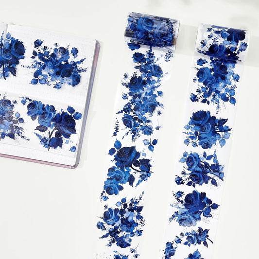 WT Cobalt Blue Wide PET Tape, Single Roll, Original Designs, Floral Decors, Transparent Clear Adhesive, Junk Journal Scrapbook Bujo Planner DIY Craft Supplies Gifts, Watercolor Flower