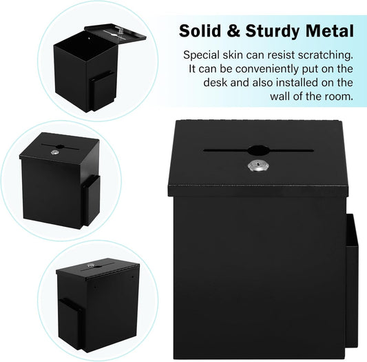 xydled Wall Mounted Ballot & Donation Box with 50 Suggestion Cards, Metal Suggestion Box with Key Lock, Collection Box, Black, 8.7"x 5.9"x7.1"