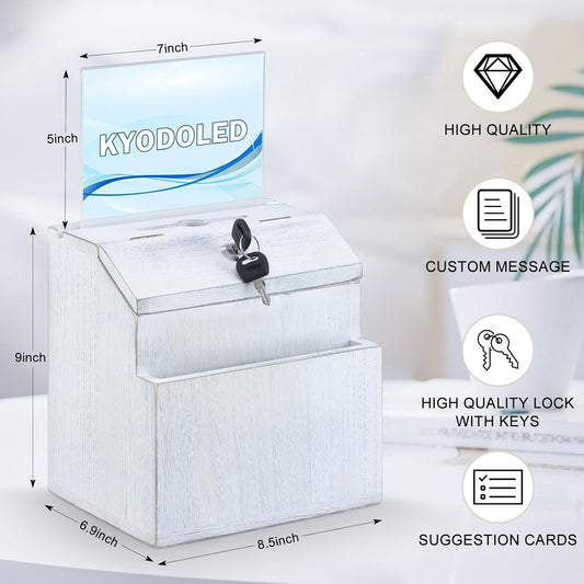 KYODOLED Wood Suggestion Box with Lock, Rustic White Ballot Box Donation and Key Drop Box with Acrylic Sign Holder and 30 Free Suggestion Cards, Wall Mounted or Freestanding, 9H x 6.9W x 8.5L Inch