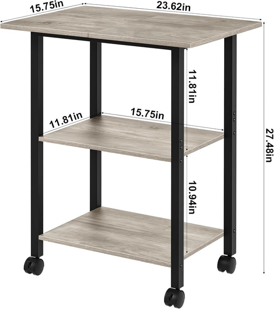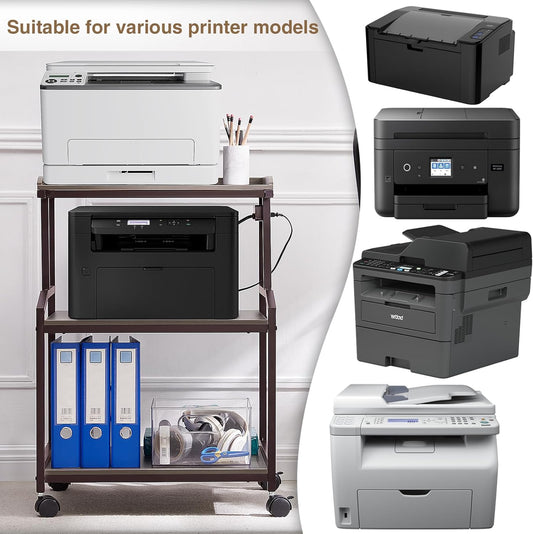 Lauren&Harold 34'' Printer Stand with Power Outlets & USB Ports, 3-Tier Adjustable Rolling Cart, Heavy Duty 150LBS Storage Table with Wheels for Office, Kitchen, Living Room, Grey/Bronze
