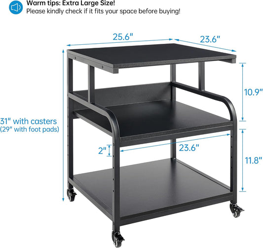 25.6" x 23.6" Extra Large Printer Stand Table with Adjustable Storage Shelf, 3 Tier Rolling Printer Cart with Industrial Wheels for Home Office, Black