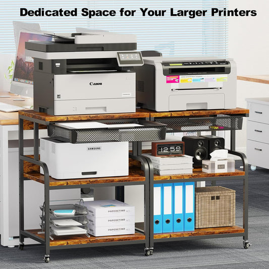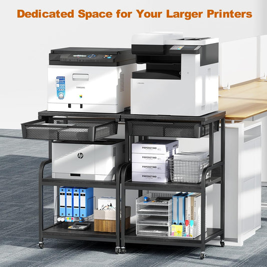 EasyCom Large Printer Stand with Storage Drawer, 5 Adjustable Shelf & 3-Tier Rolling Cart with Industrial Wheels for Desk, Mobile Printer Table for Home Office Fits 3D Printer Scanner Fax Black