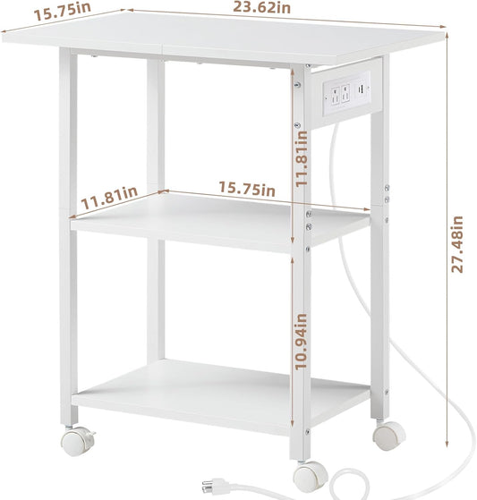 Lerliuo 3-Tier Printer Stand with Charging Station, Industrial Mobile Printer Table with Storage Shelf and Steel Frame, Rolling Printer Cart Holder with Lockable Wheels for Home, Office (White)