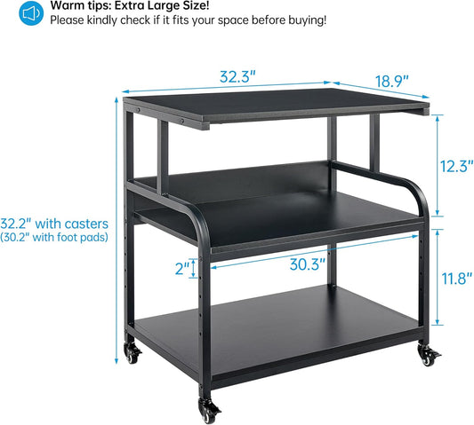32.3" x 18.9" Extra Large Printer Stand Table with Adjustable Storage Shelf, 3 Tier Rolling Printer Cart with Industrial Wheels for Home Office, Black