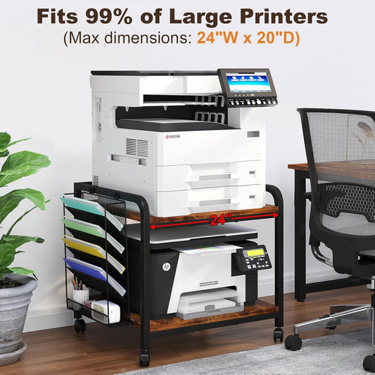 EasyCom 24"x20" Large Printer Stand with Hanging File Holder Organizer, Adjustable Height Shelf with Wheels, Under Desk Table with Storage for Printer Scanner Fax Home Office Use Rustic Brown
