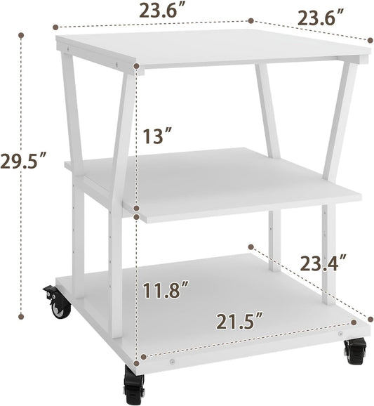 Natwind 3-Tier Large Printer Stand,23.6"x23.6"x29.5" Heavy-Duty Printer Table Cart with Paper Storage Shelf & Wheels,Ideal for Home Office Laser Printers, Copiers (White)