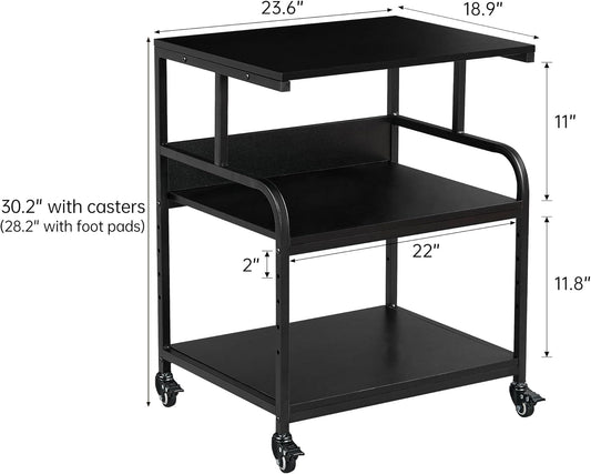 Printer Stand, 23.6 x18.9 x 30 Inches Large Printer Table with Adjustable Storage Shelf, 3 Tier Rolling Printer Cart with Wheels for Home Office, Stand for Heat Press Mini Fridge, Black