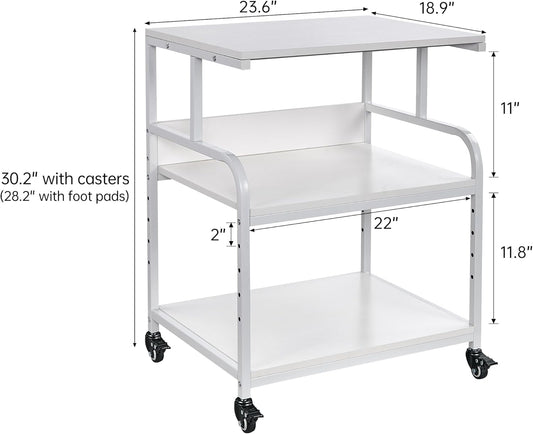 White Printer Stand, 23.6 x18.9 x 30 Inches Big Size Printer Table with Adjustable Shelf, 3 Tier Rolling Printer Cart with Wheels for Home Office Storage and Organization