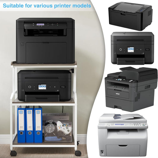 Lauren&Harold 34'' Printer Stand with Power Outlets & USB Ports, 3-Tier Adjustable Rolling Cart, Heavy Duty 150LBS Storage Table with Wheels for Office, Kitchen, Living Room, Grey/White