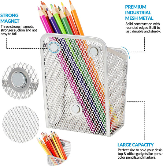 LUCYCAZ Magnetic Pen Holder - Single Magnetic Pencil Locker Holder Organizer, Silver Mesh Marker Holder Pen Basket for Whiteboard, Refrigerator and Locker