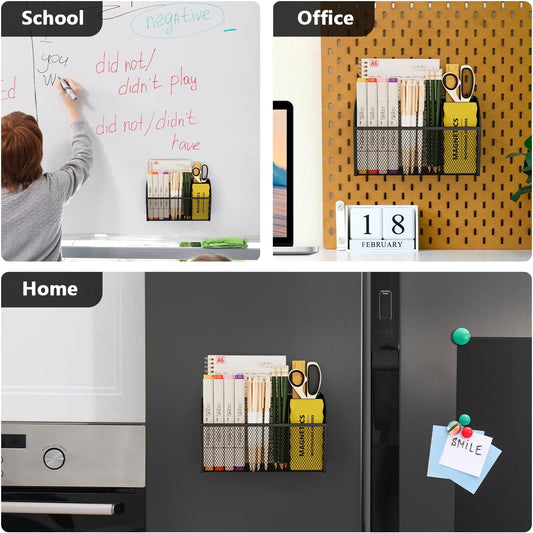 Magnetic Pencil Holder - Extra Strong Magnets Mesh Marker Holder Perfect for Whiteboard, Refrigerator and Locker Accessories (3 Baskets, 1 Pack Black)