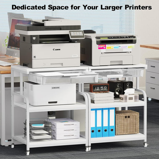 EasyCom 23.6''x18.9'' Extra Large Printer Stand with Drawer, 5-Adjustable Heights 3 Tier Table with Wheels, Rolling Printer Cart with Storage for Printer Scanner Fax Home Office Use