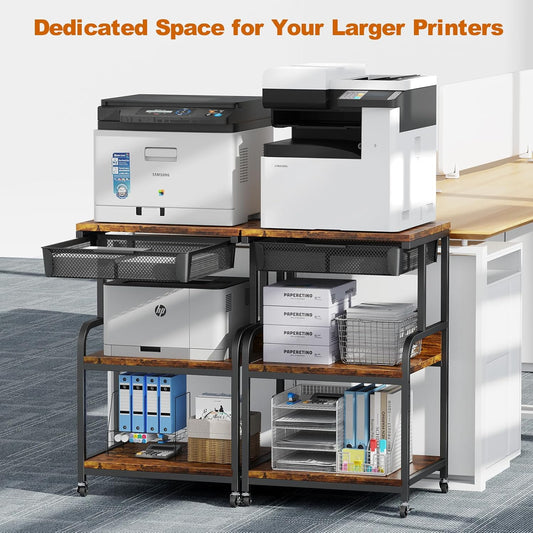 EasyCom Large Printer Stand with Storage Drawer, 5 Adjustable Shelf & 3-Tier Rolling Cart with Industrial Wheels for Desk, Mobile Printer Table for Home Office Fits 3D Printer Scanner Fax Rustic Brown