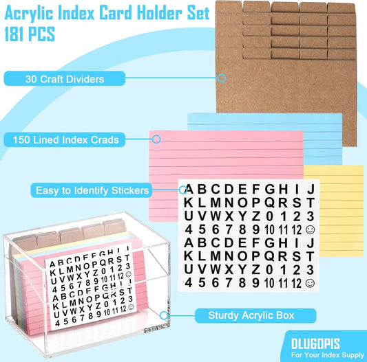 3 x 5 Inch Acrylic Index Card Holder Clear Flash Card Holder Recipe Card Box 150 Pcs Ruled Lined Index Cards 30 Pcs Kraft Dividers A to Z Stickers For Holds 400 A-Z Tabs Note Cards Business Cards