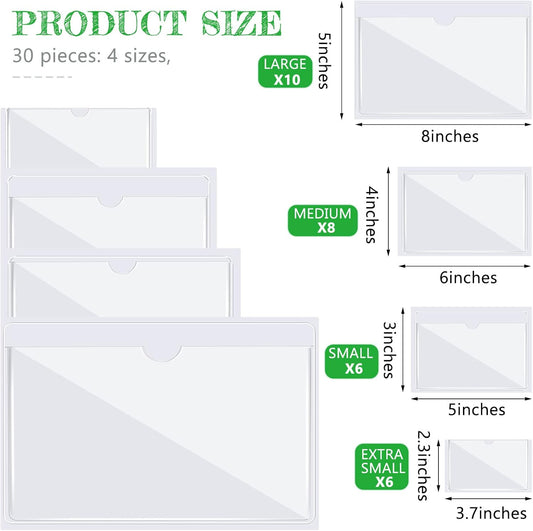 Chinco 30 Pcs Self Adhesive Pockets, Bin Labels for Storage Bins, Clear Pocket Label Sleeves, Plastic Index Card Holder with Top Open for Organizing Bins Box Drawer(Mixed Sizes)