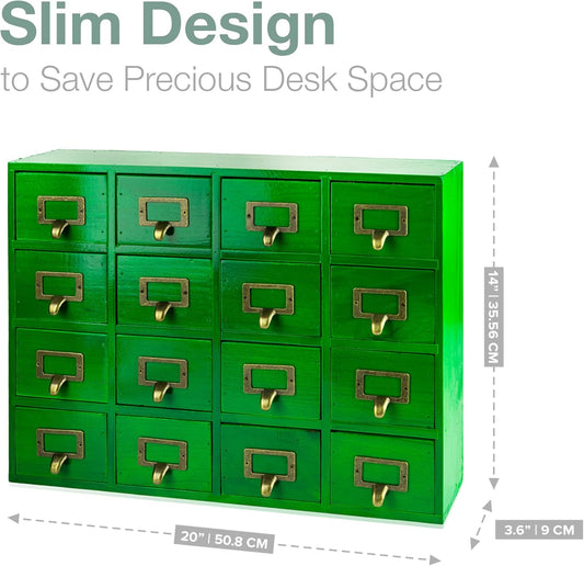 Emerald Green Wood 16-Drawer Apothecary Small Cabinet - 20" x3.6”x14” Card Catalog Style Table Top Organizer - Wooden Storage Box w/16 Drawers - 4-Level Countertop Organizer w/Label Holders & Handles