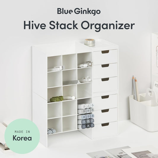 BLUE GINKGO Hive Stack Desk Organizer – Stackable Pen Holder, Stationary Organizer with Drawers - Office Storage, School Supplies, Makeup (Made in Korea, White)