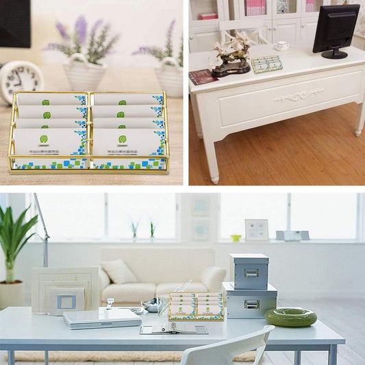 Hipiwe Glass Business Card Holder Stand 8 Slot Name Cards Display Storage Holder Gold Metal Business Cards Organizer for Office Desktop Countertop
