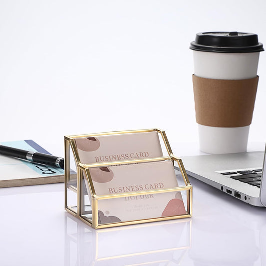Hipiwe Glass Business Card Holder 2 Slots Gold Business Card Stand Mirrored Base Name Display Holder for Desk Multiple Clear Business Card Holder Display for Office