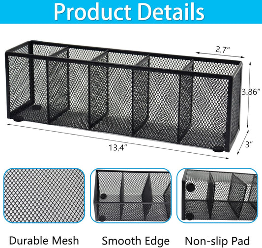 Black Mesh Pen Pencil Holder, Small Metal Desk Organizer Desktop Stationery Office Supplies Acessories Storage Stand, 5 Compartments Brushes Holder for Home School Classroom Teachers
