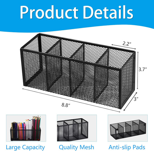 Black Mesh Pen Holder, Metal Desk Organizer Desktop Stationery Office Supplies Acessories Storage Stand, 4 Compartments Pencil Organizer Brushes Holder for Home School Classroom Teachers