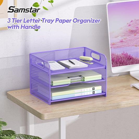 Samstar 3 Tier Purple Letter Tray Paper Organizer with Handle, Mesh Desk Organizer Paper Sorter File Rack Shelves, Purple