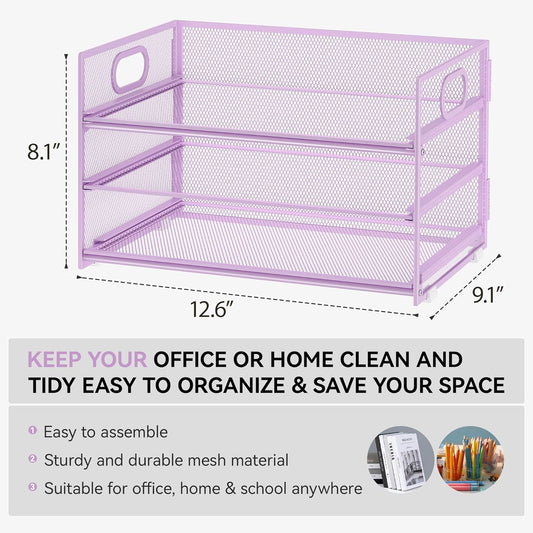 Subekyu 2-Pack 3-Tier Purple Metal Mesh Desk Paper Letter Tray & File Sorter Organizer with Handle + 1 Sliding Tray for Desk, Home, Office, School Supplies, A4 Paper and Accessories Storage