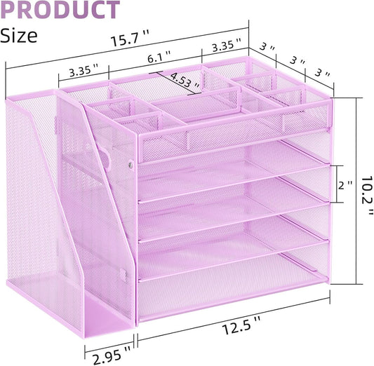 Marbrasse Desk Organizers and Accessories, 5-Tier Paper Letter Tray Organizer with File Holder, Mesh File Organizer, Office Desk Accessories & Organization for Supplies (Purple)