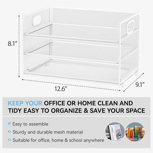 Subekyu 3 Tier Letter Tray Paper Organizer with Handle, 1 PC Sliding Tray, White Metal Mesh Desk File Folder Paper Sorter Organizer for Home Office School Desk Supplies Organization Storage