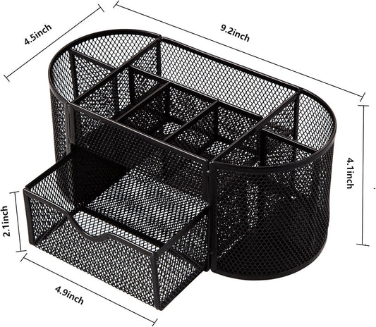 Comix Mesh Pen Pencil Holder Desk Organizer, 8 Compartment and 1 Drawer Wire Desktop Pen Pencil Cup Caddy Office Supplies Accessories for Home Office School, Black