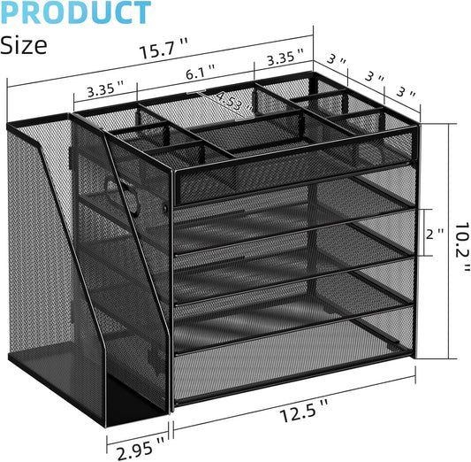 Marbrasse 5-Tier Desk Organizer with File Holder,Paper Letter Tray Organizer,Desktop File Organizer with Adjustable Compartments,Mesh Desk Organizers and Accessories for Office Supplies,Black