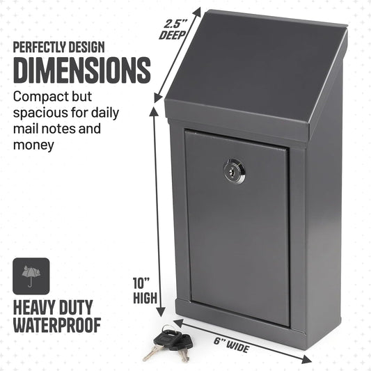 Metal Donation Box-Suggestion Box with Slot and lock-Cash Lock box for Money-Waterproof Drop Box-Comment and ballot voting box-comes with pre-drilled holes for easy wall mounting 10 X 6 X 2.5"(Gray)