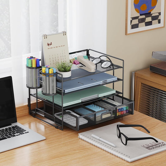 Marbrasse Desk Organizer and Accessories4-Tier Paper File Letter Tray Accessories & Workspace Desk Organizers with Drawer and 2 Pen Holders for School Home Office Supplies (Black)
