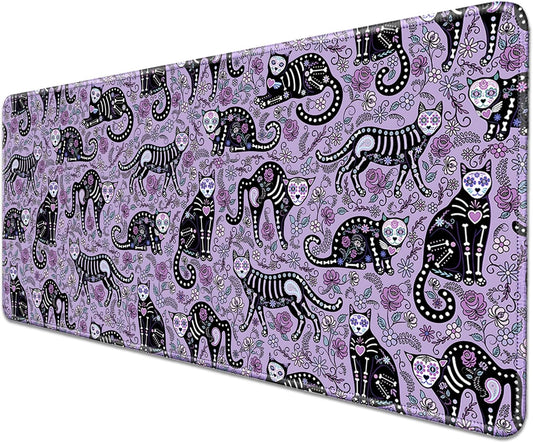 Gothic Cat Skeleton Flowers Mouse Pad,Extended Cat and Floral Mousepad Desk Pad with Stitched Edges,Non-Slip Waterproof Rubber Base Mouse Mat for Office Computer Keyboard Laptop Home(27.5x11.8 in)