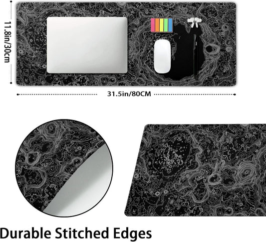 Black Whtie Topographic Gaming Mouse Pad XL Topo Moon Relief Map Extended Large Mat Mousepad Desk Pad Non-Slip Rubber Base Stitched Edge Long Keyboard Playmat for Desk Computer,31.5×11.8 Inch
