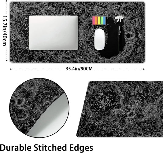 Black Whtie Topographic Gaming Mouse Pad XXL Topo Moon Relief Map Extended Large Mat Mousepad Desk Pad Non-Slip Rubber Base Stitched Edge Long Mousepad for Desktop Office Desk, 35.4 x 15.7 in