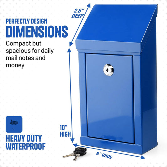Suggestion Box with Lock and keys, Metal Wall Mounted Ballot Box, Iron steel Donation and Collection Drop Box 8.5" H x 6" W x 7" L with wide 5.5" Slot and front sheet holder (Blue)